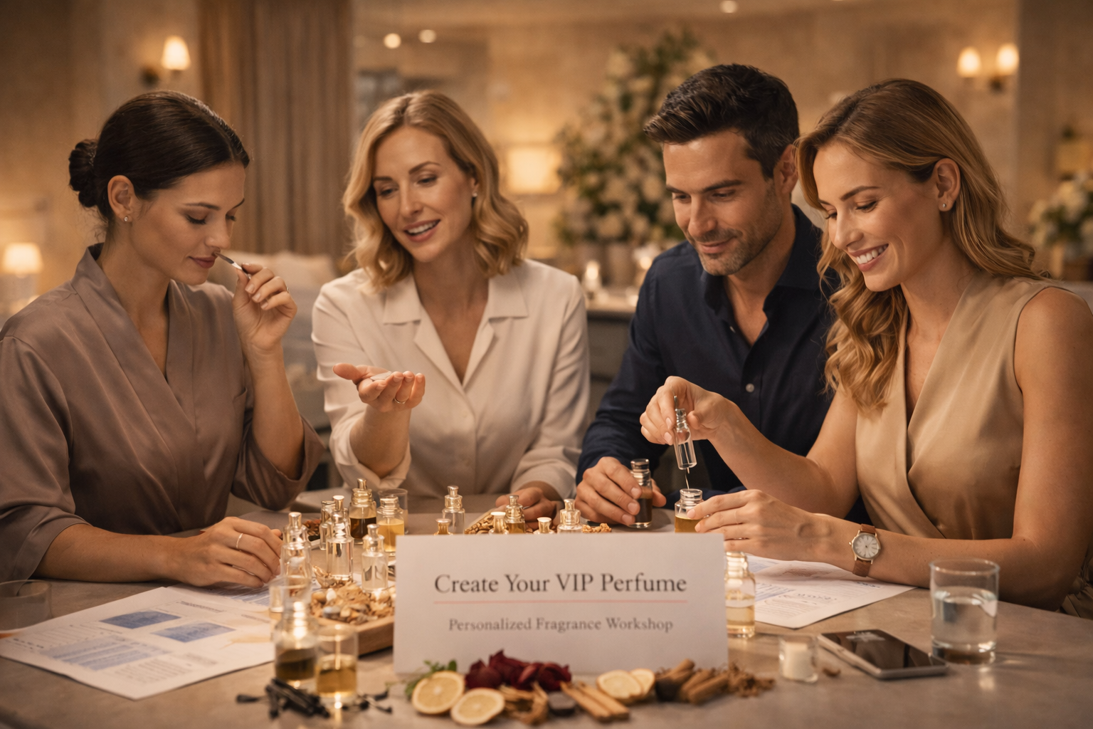 A curated perfume creation workshop designed for spa guests, hotel clients, and luxury residential communities. Participants discover premium raw materials and create their own personalized fragrance, guided by an aroma expert.