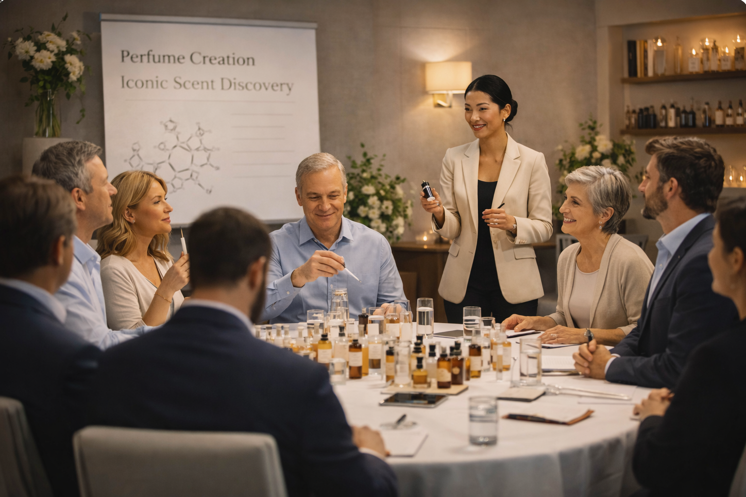 A lighter, accessible olfactive workshop designed for corporate groups, associations, and mature audiences. Participants are introduced to perfume creation and the concept of an iconic scent in a relaxed, engaging format.